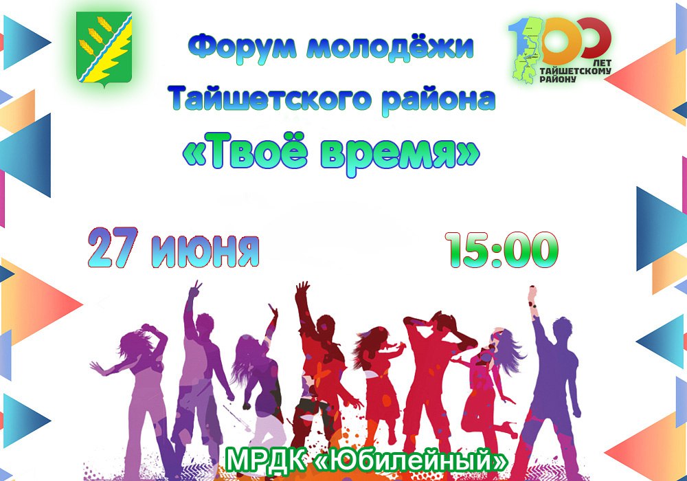 Приглашаем на форум молодежи Тайшетского района «Твое время», который пройдет 27 июня по адресу: г. Тайшет, ул. Юбилейная, 4а (ДК «Юбилейный»).
