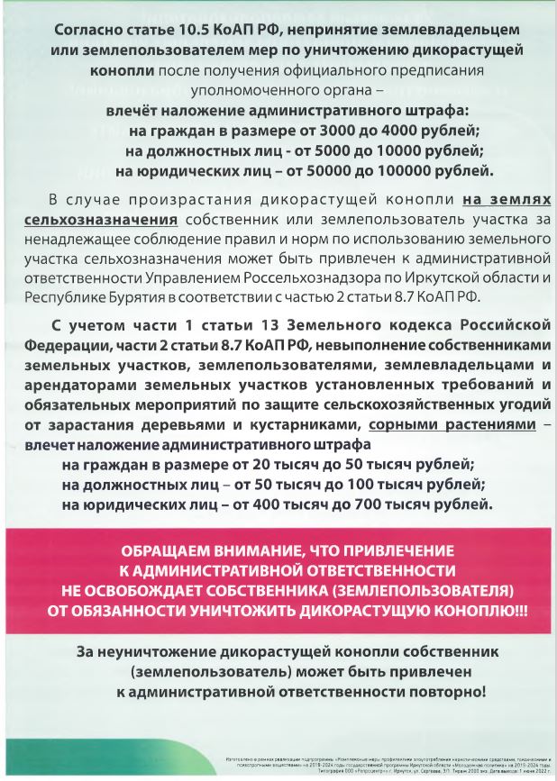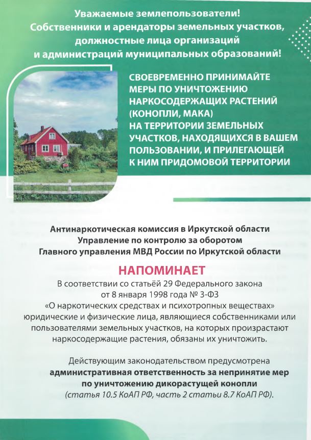 Своевременно принимайте меры по уничтожению наркосодержащих растений (конопли, мака) на территории земельных участков, находящихся в вашем пользовании, и прилегающей к ним придомовой территории.